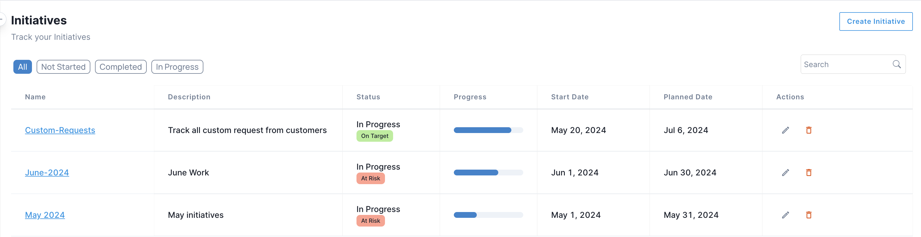 * **Planned Date**: Shows the target completion date for the initiative.