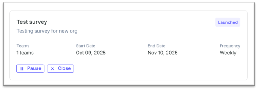 Once launched, the survey shows Launched status. You’ll see options to Pause or Close the survey at any time.