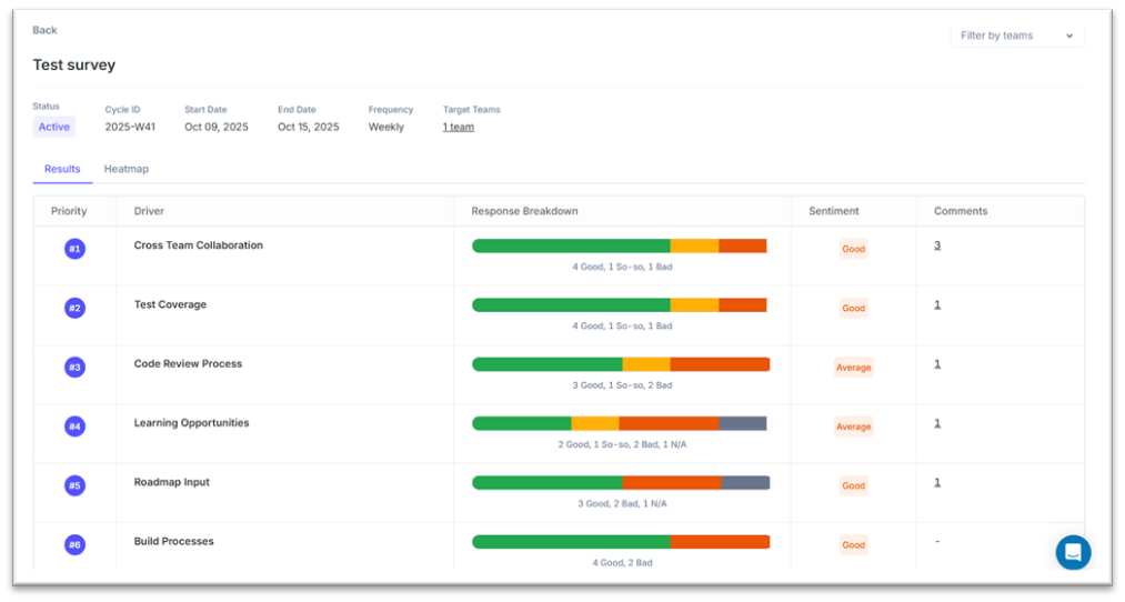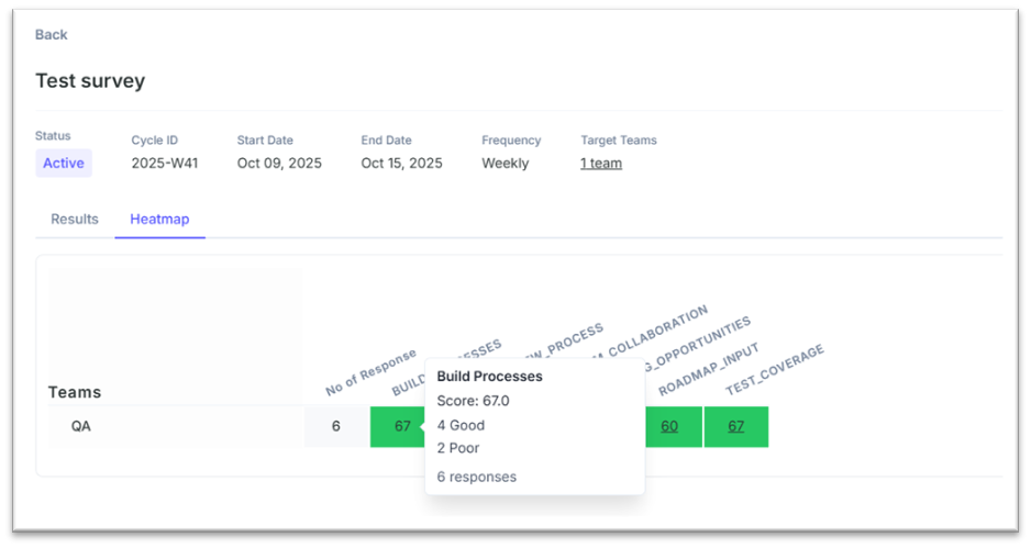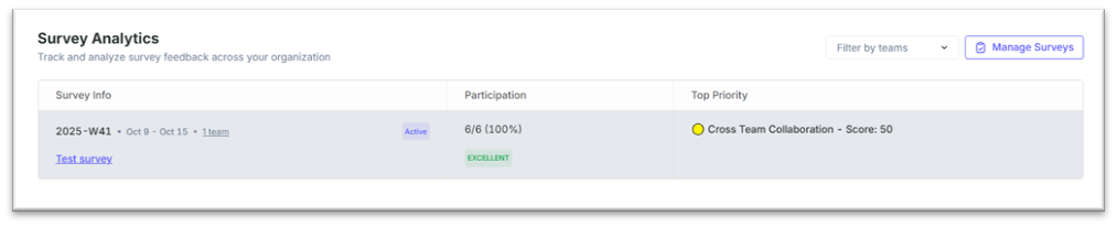 • Survey Info — cycle, date range, teams, and status (Active).