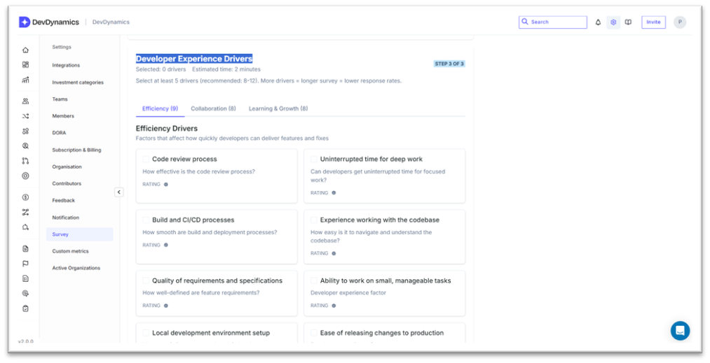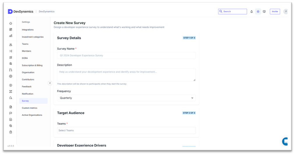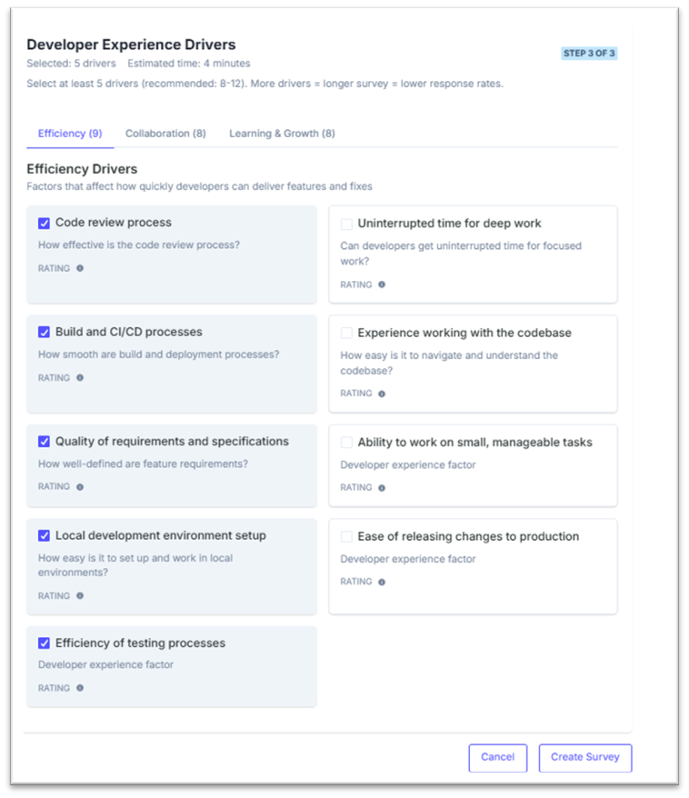 Enter the basic details: Survey Name, Description, Frequency (Weekly, Fortnightly, Monthly, Quarterly, Yearly, or Once), and Target Audience (select team(s)). Then pick the Developer Experience Drivers—the questions—grouped into Efficiency, Collaboration, and Learning & Growth.