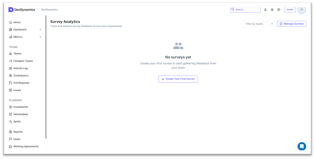 Go to Survey in the left navigation. The Survey Analytics page opens. Click Create Your First Survey to get started.
