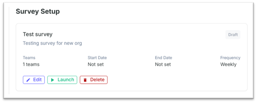 After clicking Create Survey, you’ll see a success message and the survey appears under Survey Setup as a draft.