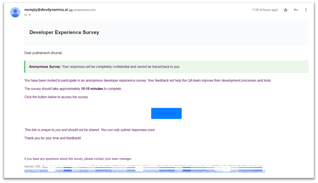 Participants receive a unique email invite with a button to take the survey, based on the start date you set.