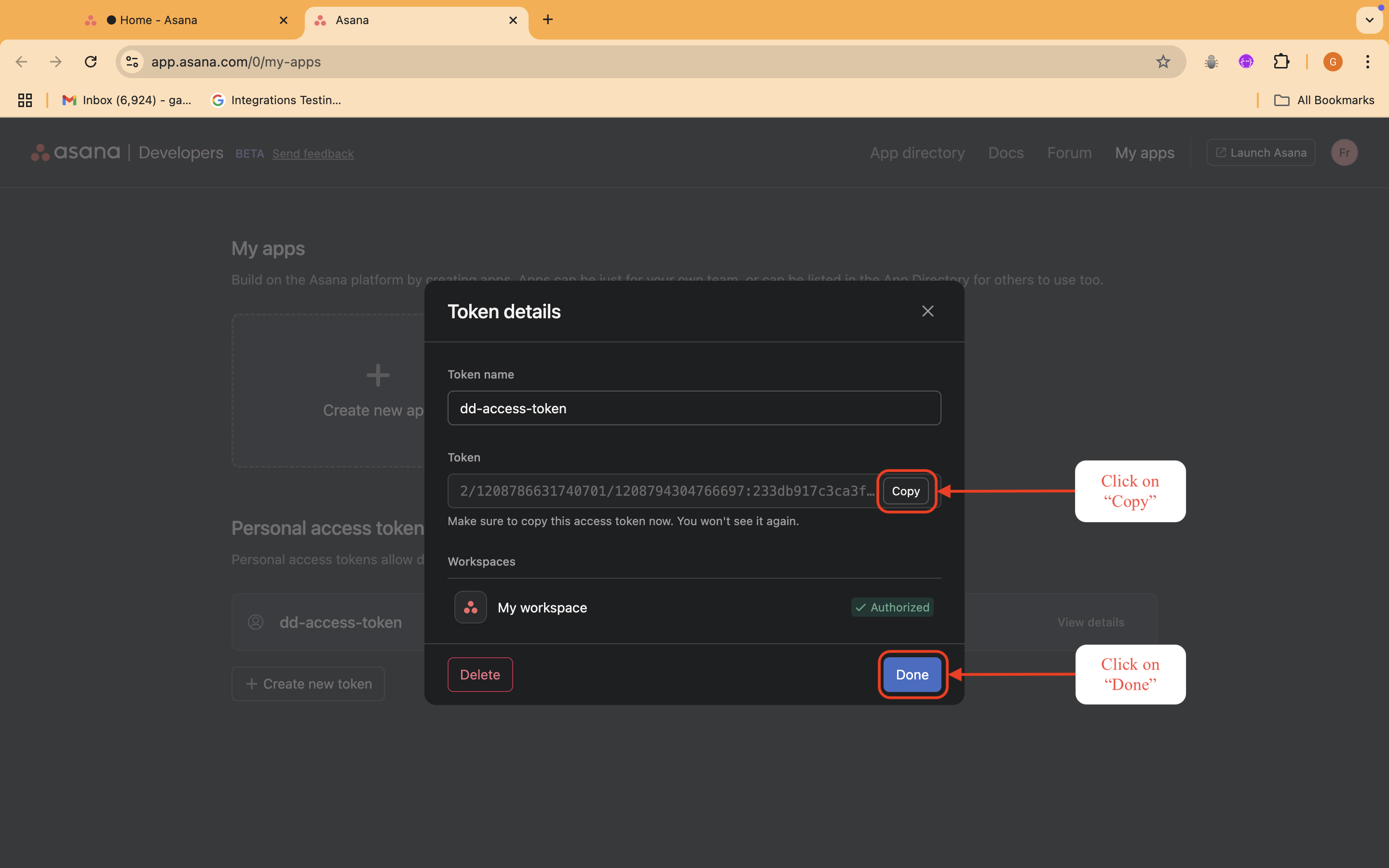 Once the token is generated, **copy it immediately**, as Asana will only display it once.