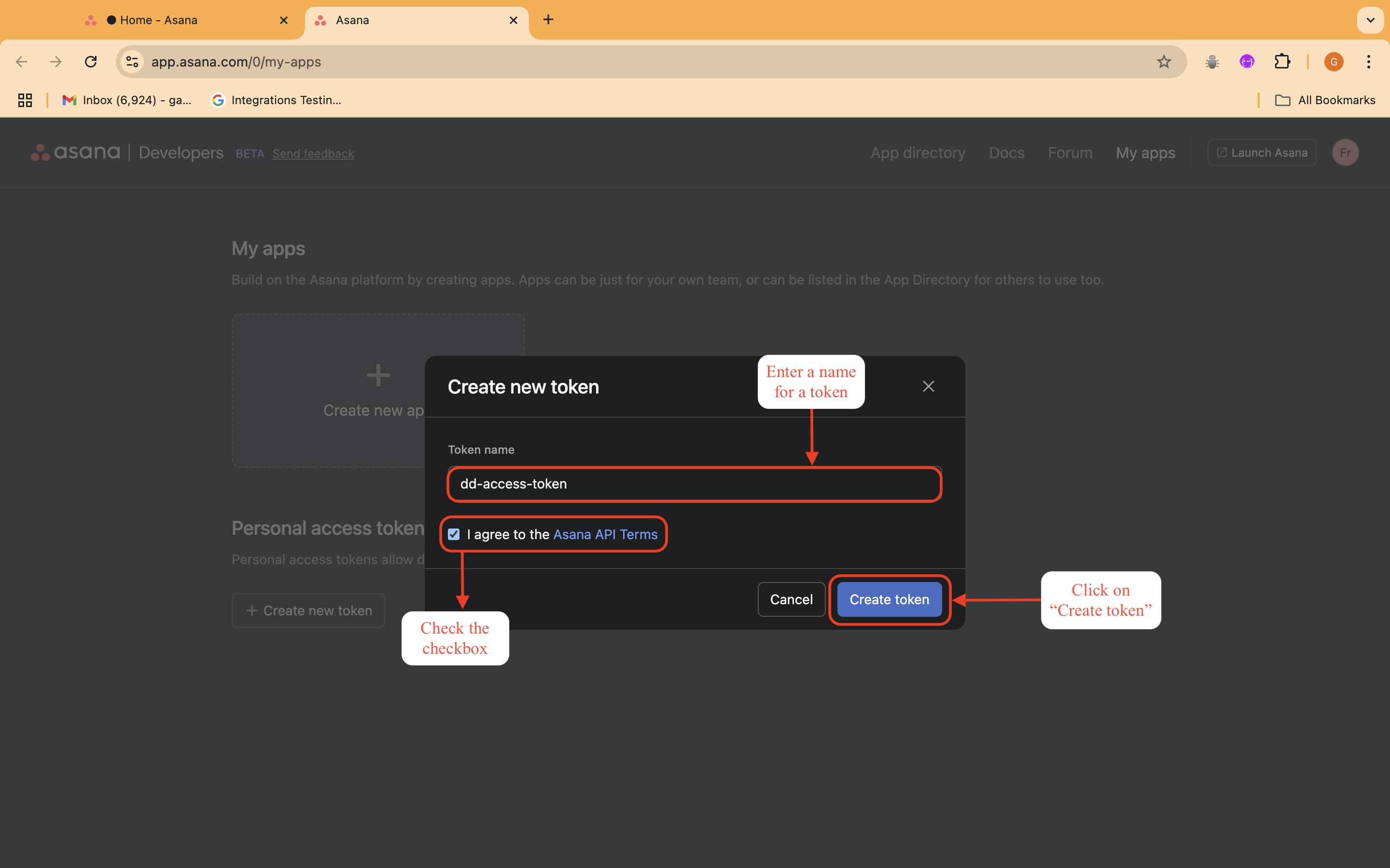 3. Agree to the **Asana API Terms** by checking the appropriate checkbox.