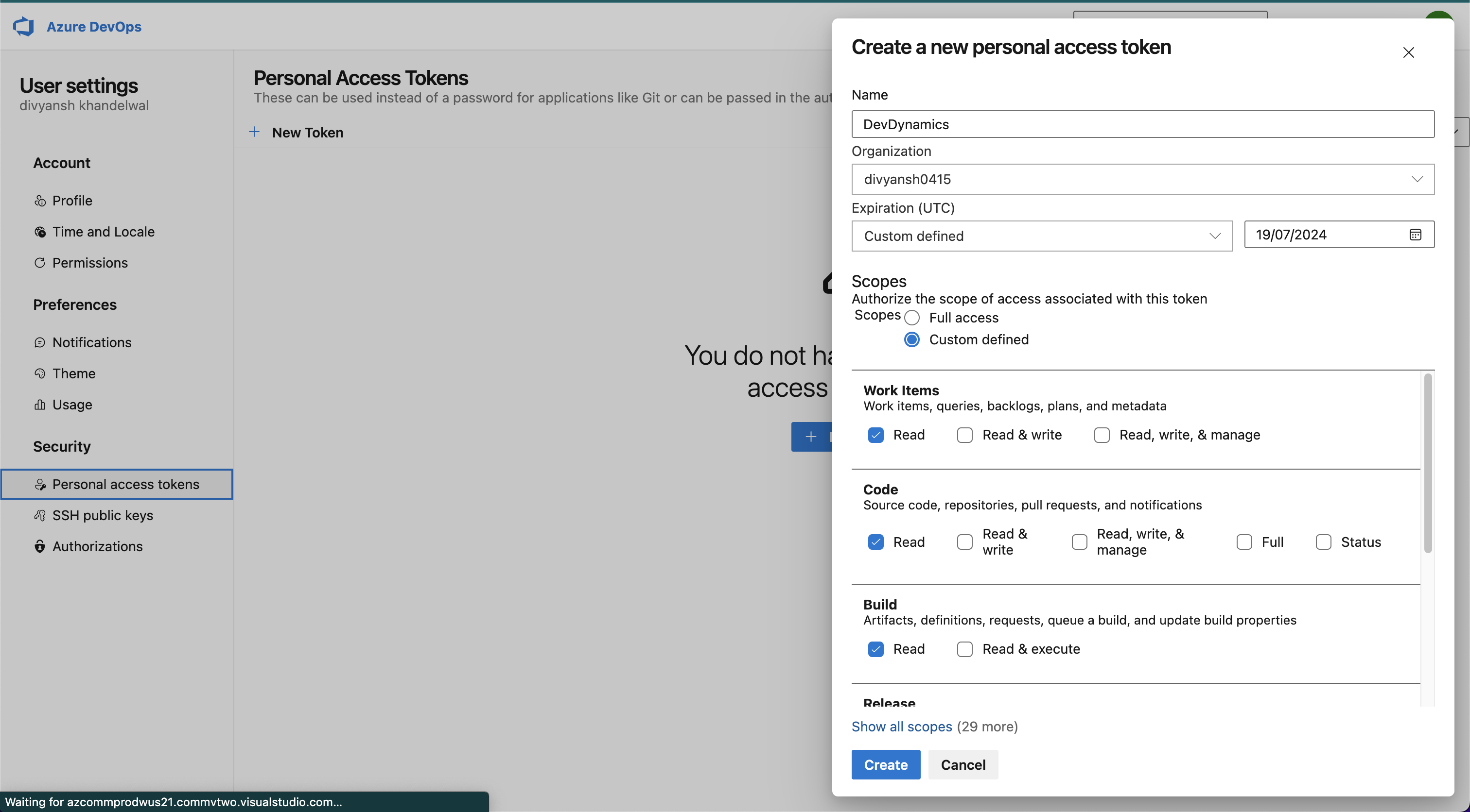 6. Create a new Personal Access Token. Add all the read permissions to the token.\\