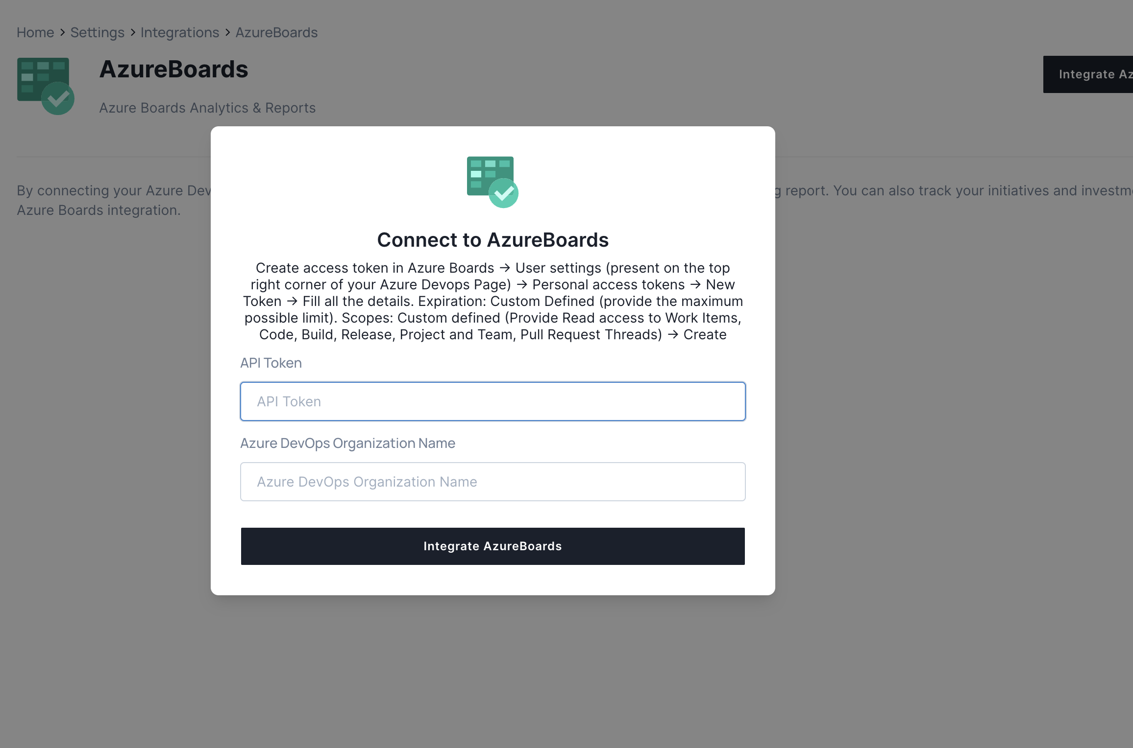 4. Click on Integrate Azure Repo, enter the API token and the Organization name\\