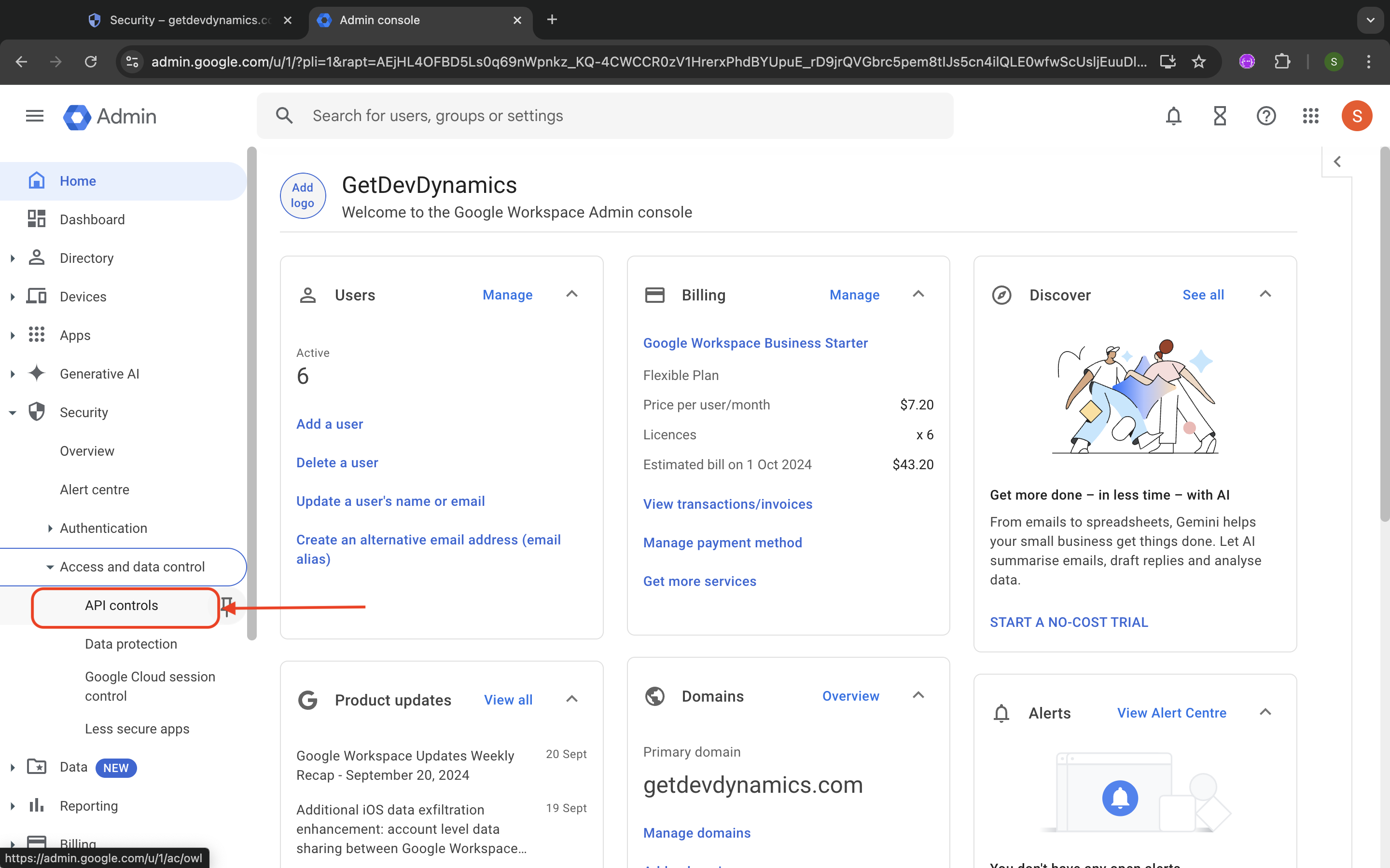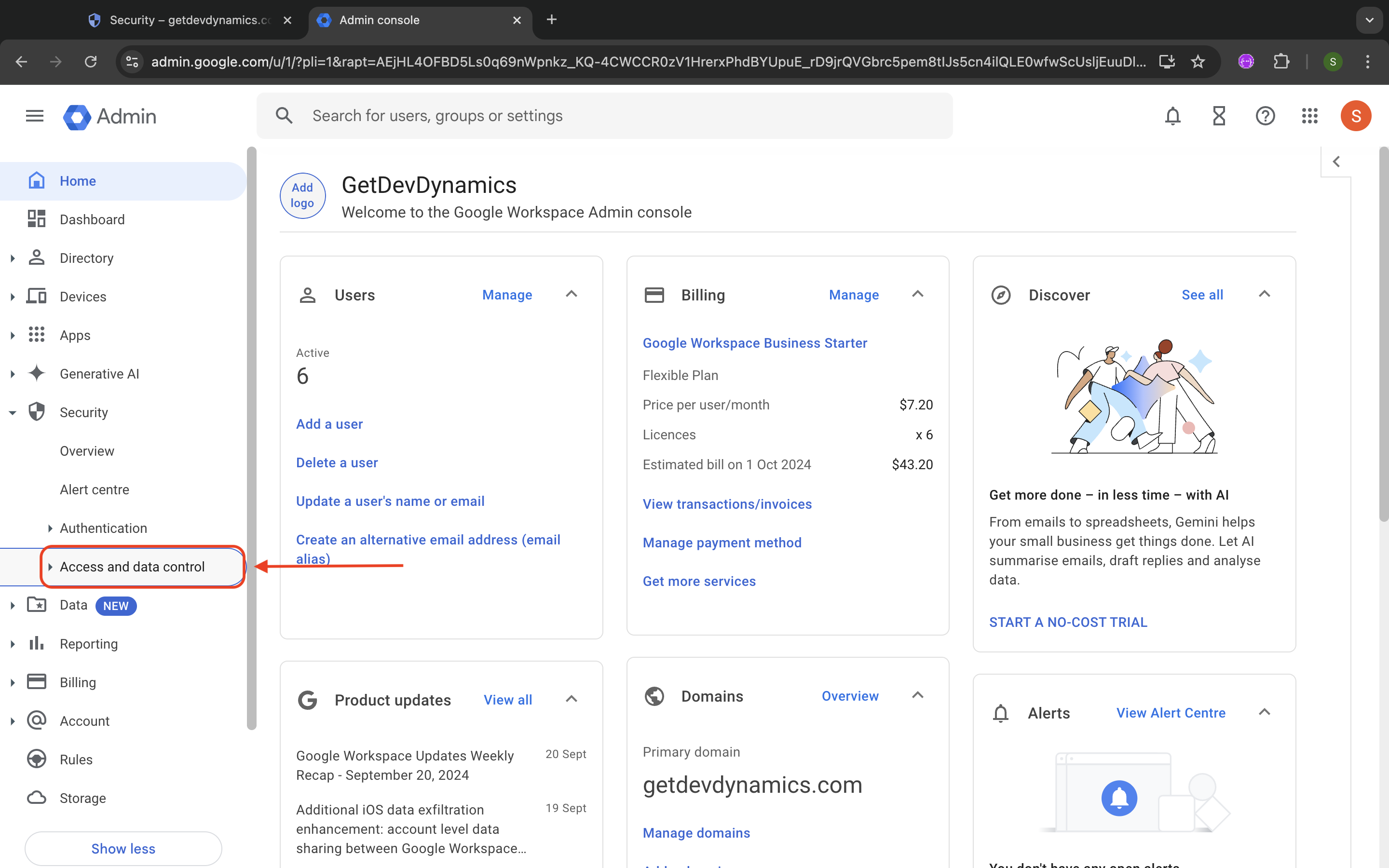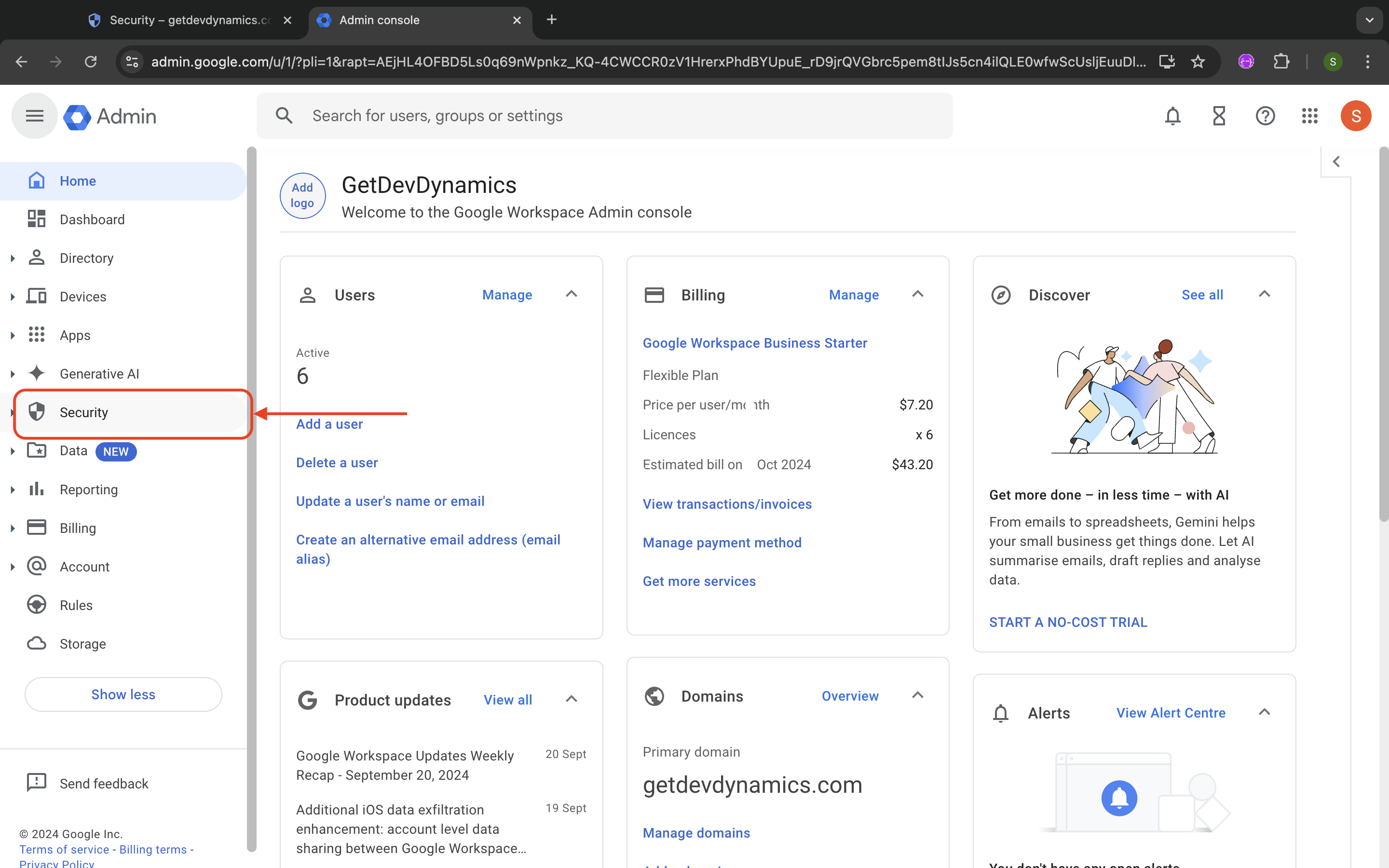 * **Access the Google Admin Console**: Go to your Google Workspace domain's [Admin Console](https://admin.google.com) and select `Security` from the left sidebar.