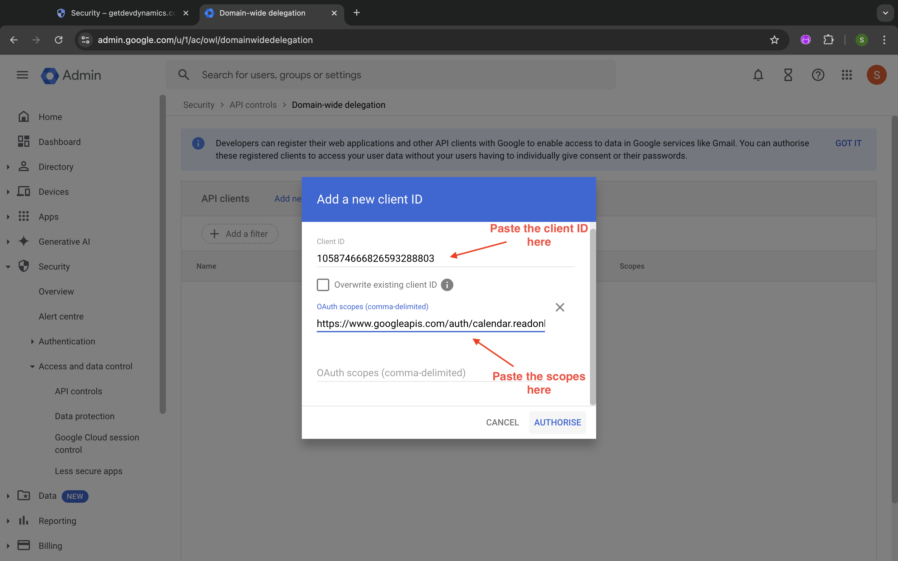 <figure><img src="https://4171758421-files.gitbook.io/~/files/v0/b/gitbook-x-prod.appspot.com/o/spaces%2FS4rgvJ71tpXan8RhYTT4%2Fuploads%2Fgit-blob-8cacd72ce45a9bec3d8691193a36aa5574d3a382%2Fgcalendar-manage-domain-wide-delegation.png?alt=media" alt=""><figcaption></figcaption></figure>